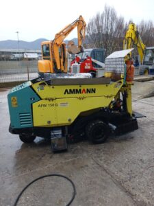 La Ammann AFW 150 G (e la sua evoluzione AFW 150-2) è una mini-finitrice gommata idrostatica compatta, ideale per stese in spazi ristretti, marciapiedi, piste ciclabili e ripristino trincee
